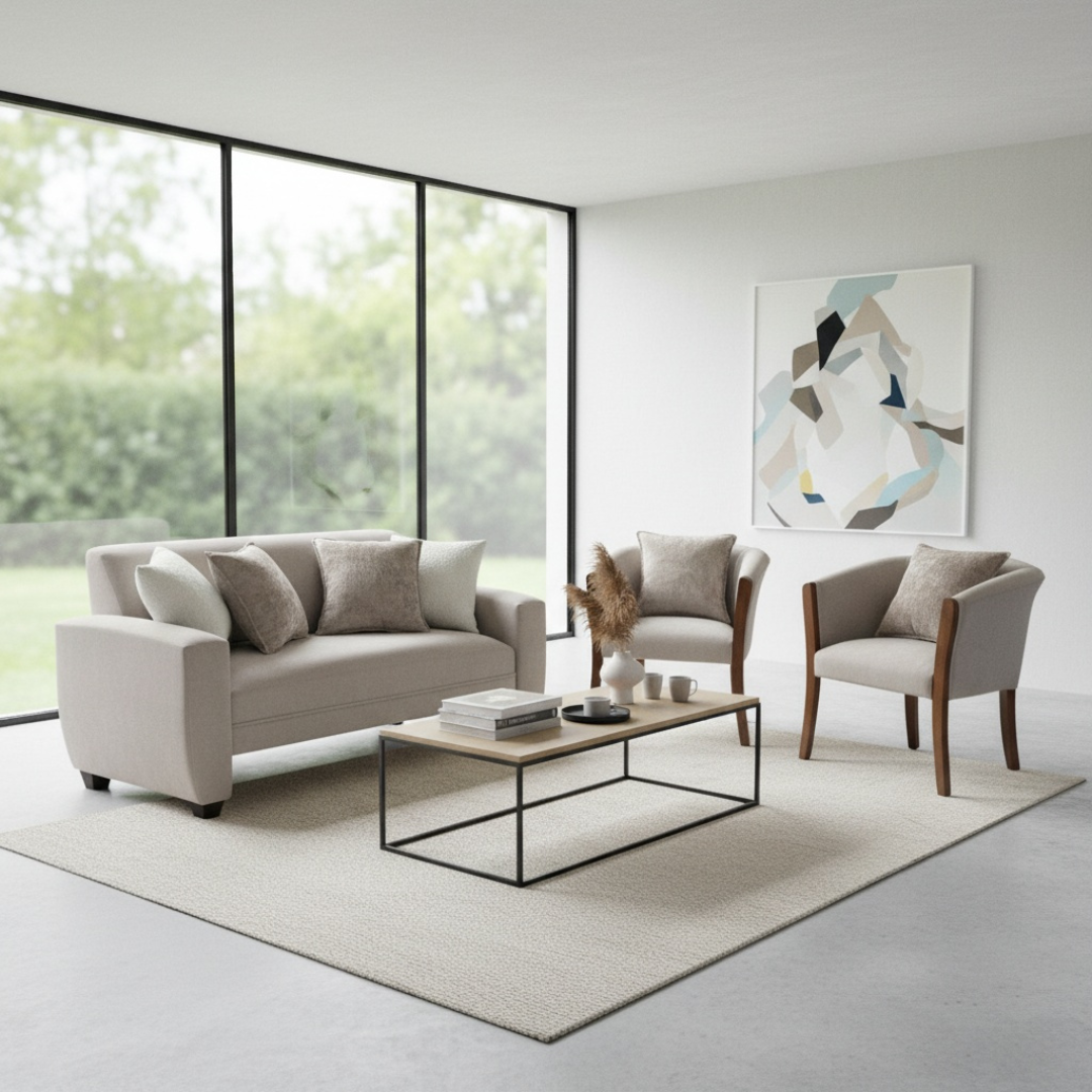 Set de sofá 2 cuerpos (1,50 m) y dos poltronas tapizadas en Lino color arena, resistente y suave al tacto. Patas de madera curvadas que aportan un toque moderno y elegante. Incluye 2 cojines gratis para mayor comodidad y estilo. Ideal para sala de estar o living.
