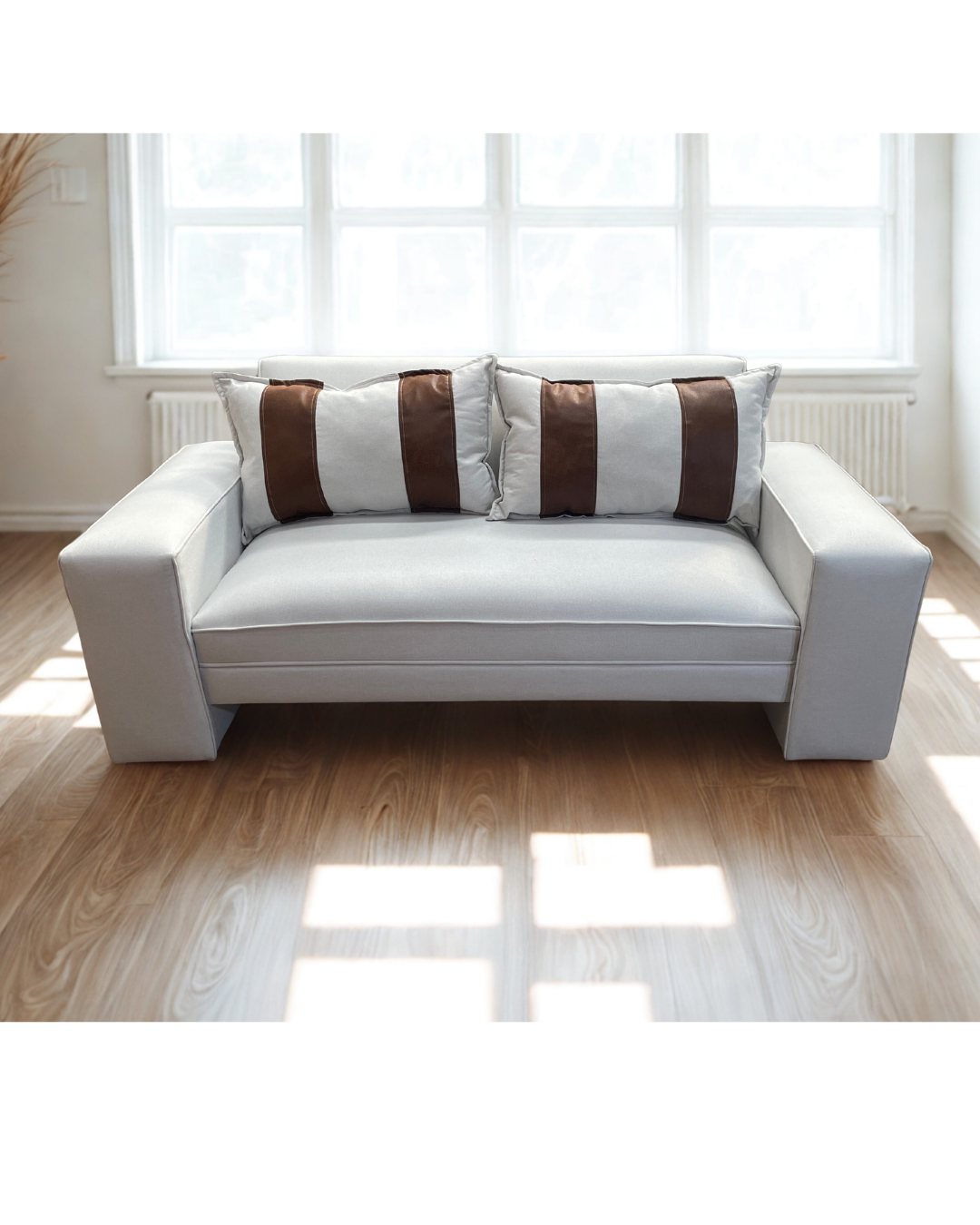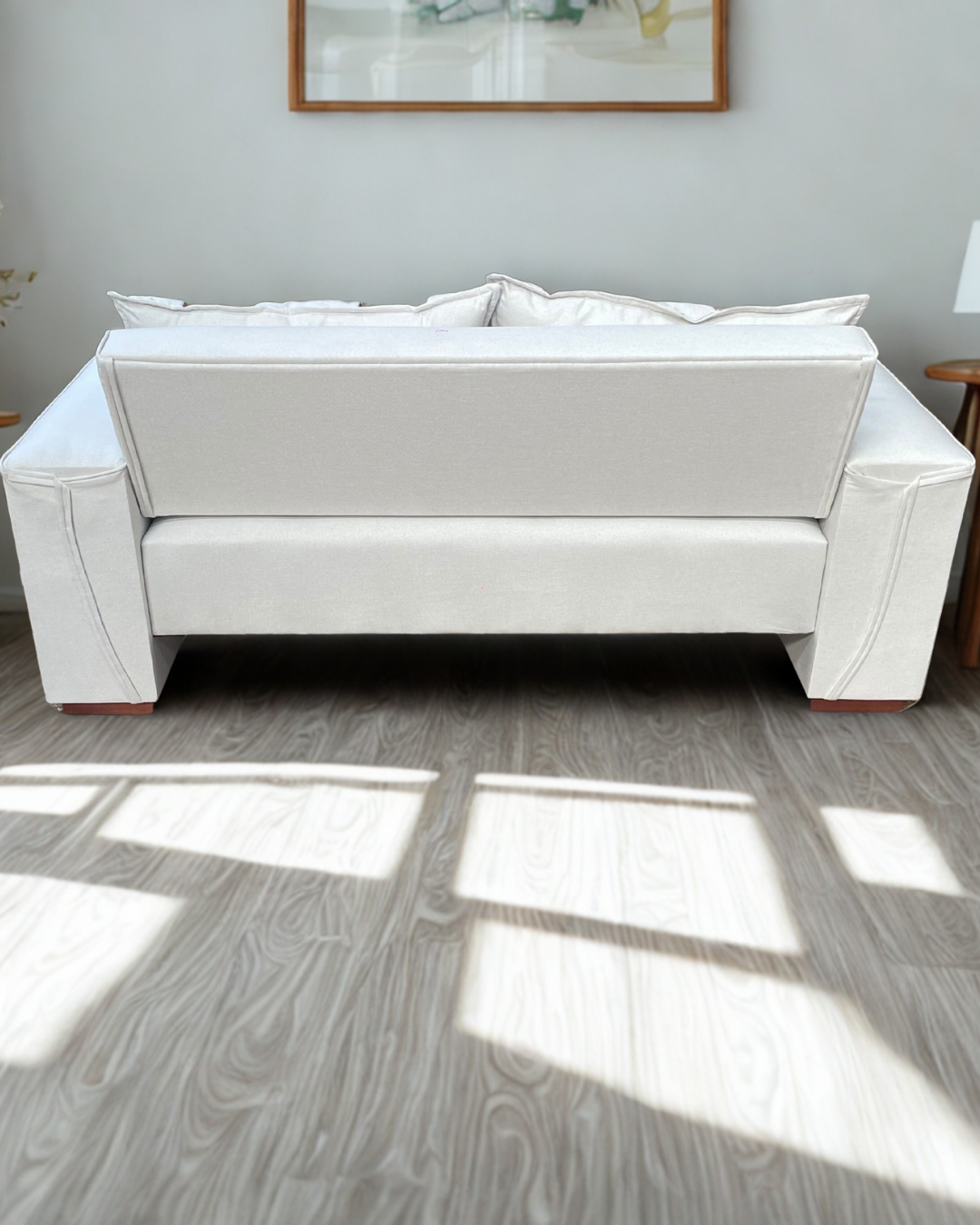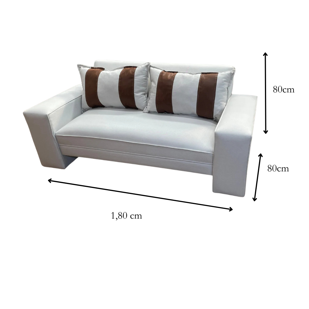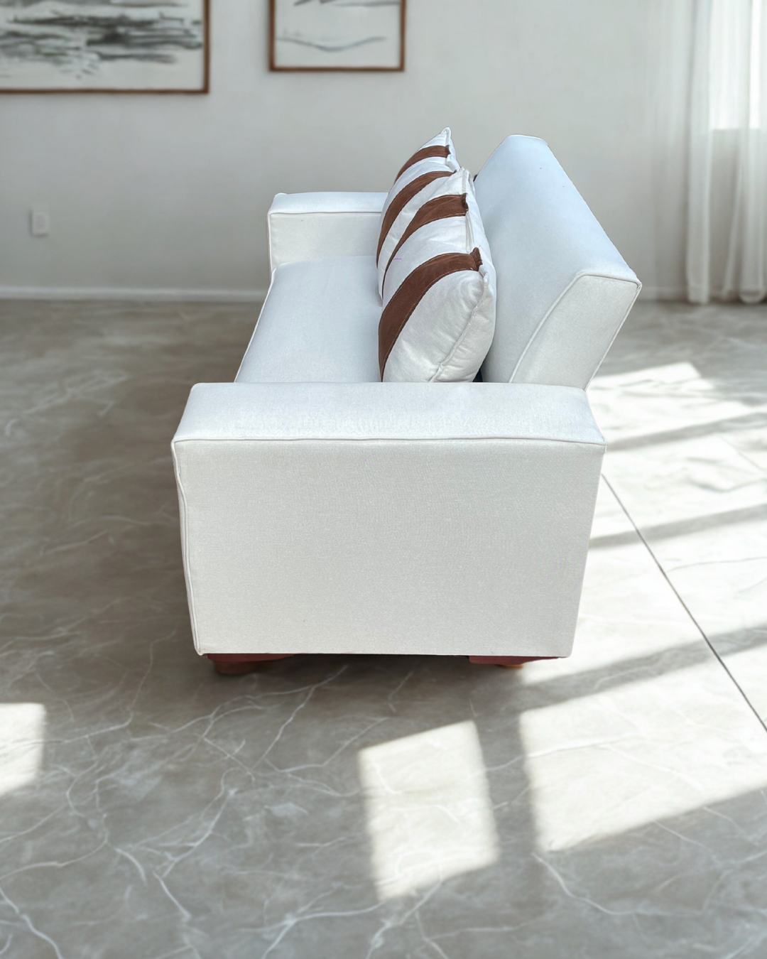 Incluye cojines integrados con franjas en ecocuero café, aportando contraste y carácter. Sus brazos cuadrados de 20 cm le dan firmeza y una presencia sólida, mientras que su estructura de madera garantiza resistencia y durabilidad.