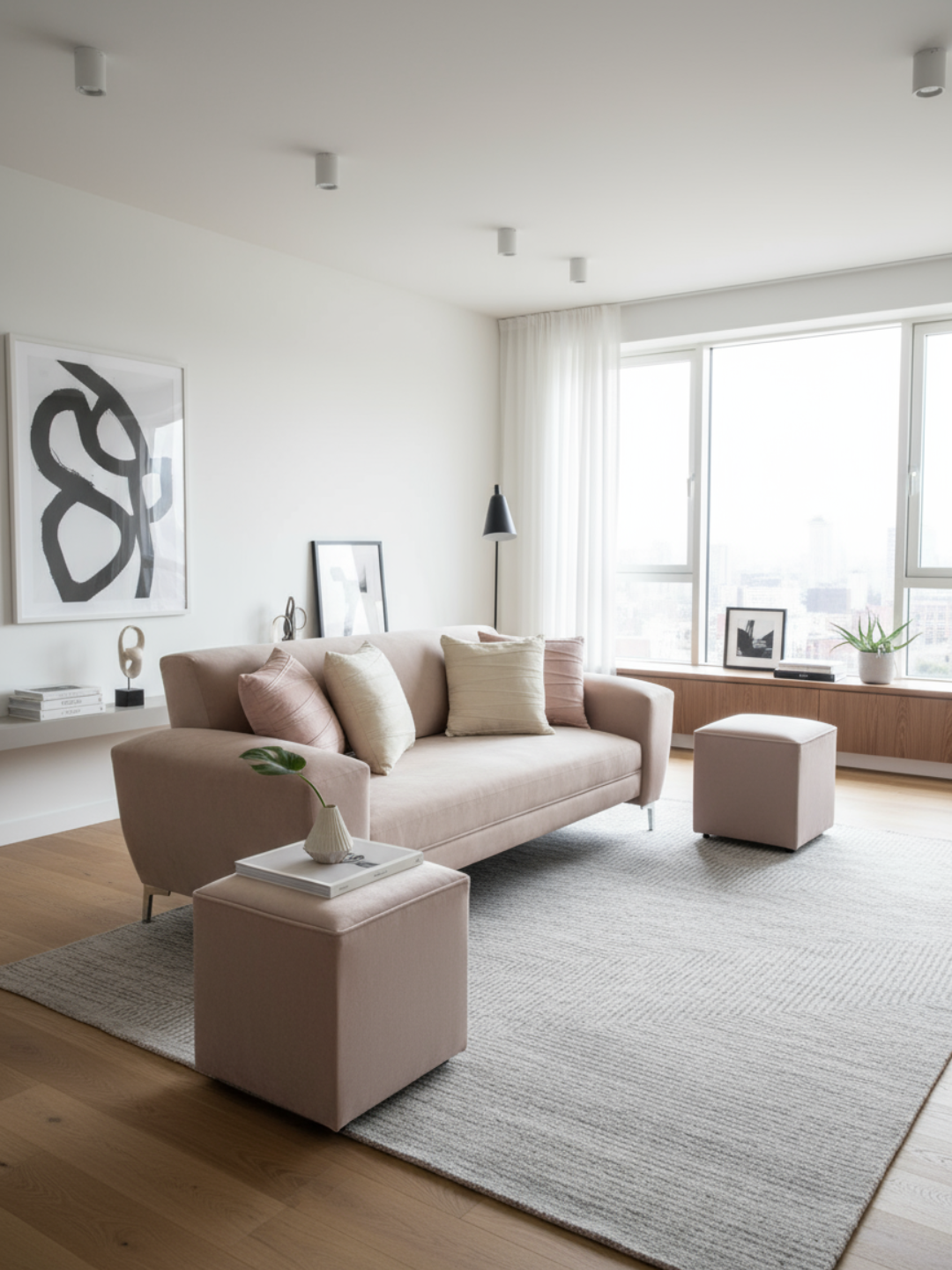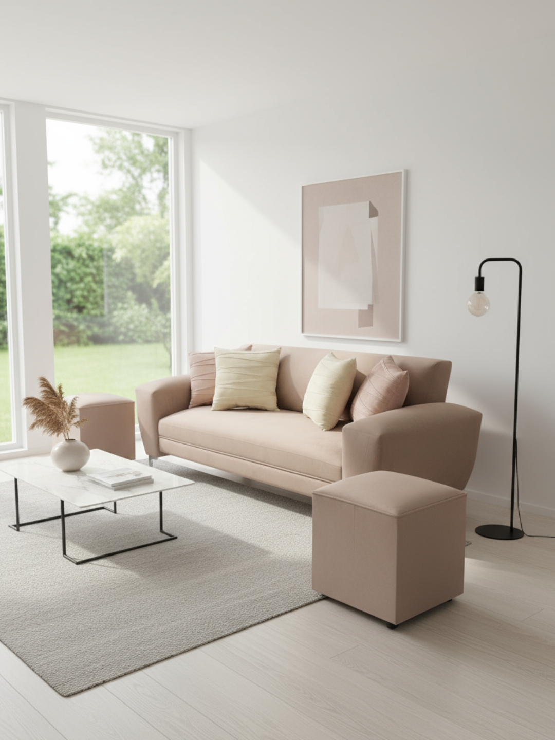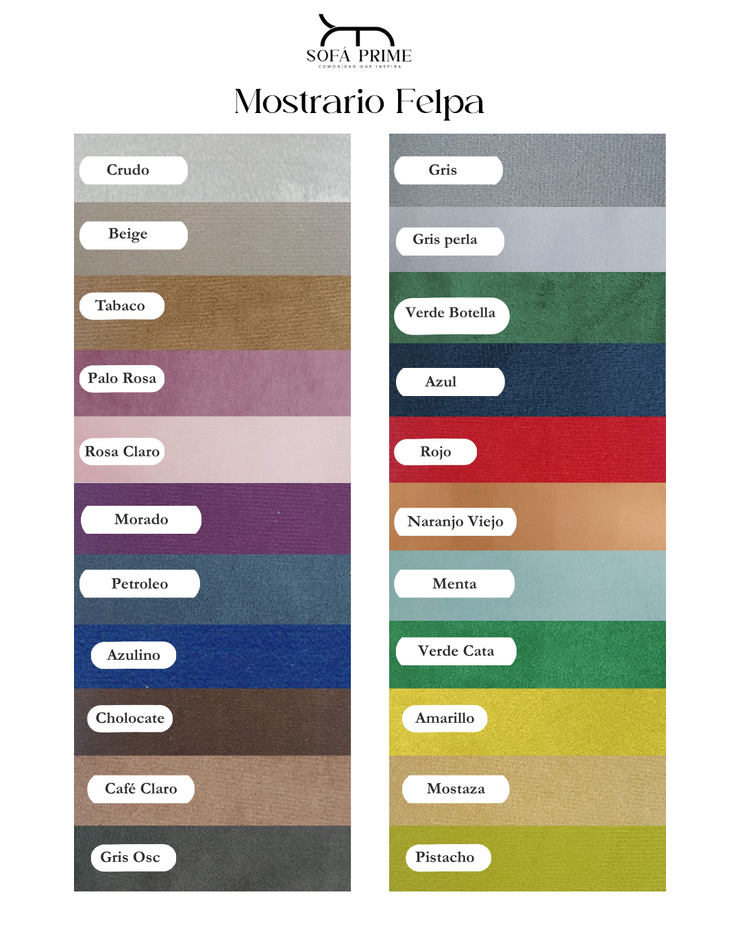 El Trío Prime Vermont incluye un sofá de 2 metros, dos puff de 42x42 cm y dos cojines de regalo, todo tapizado en felpa color damasco, una tela aterciopelada y suave que aporta calidez y estilo a tu espacio.
