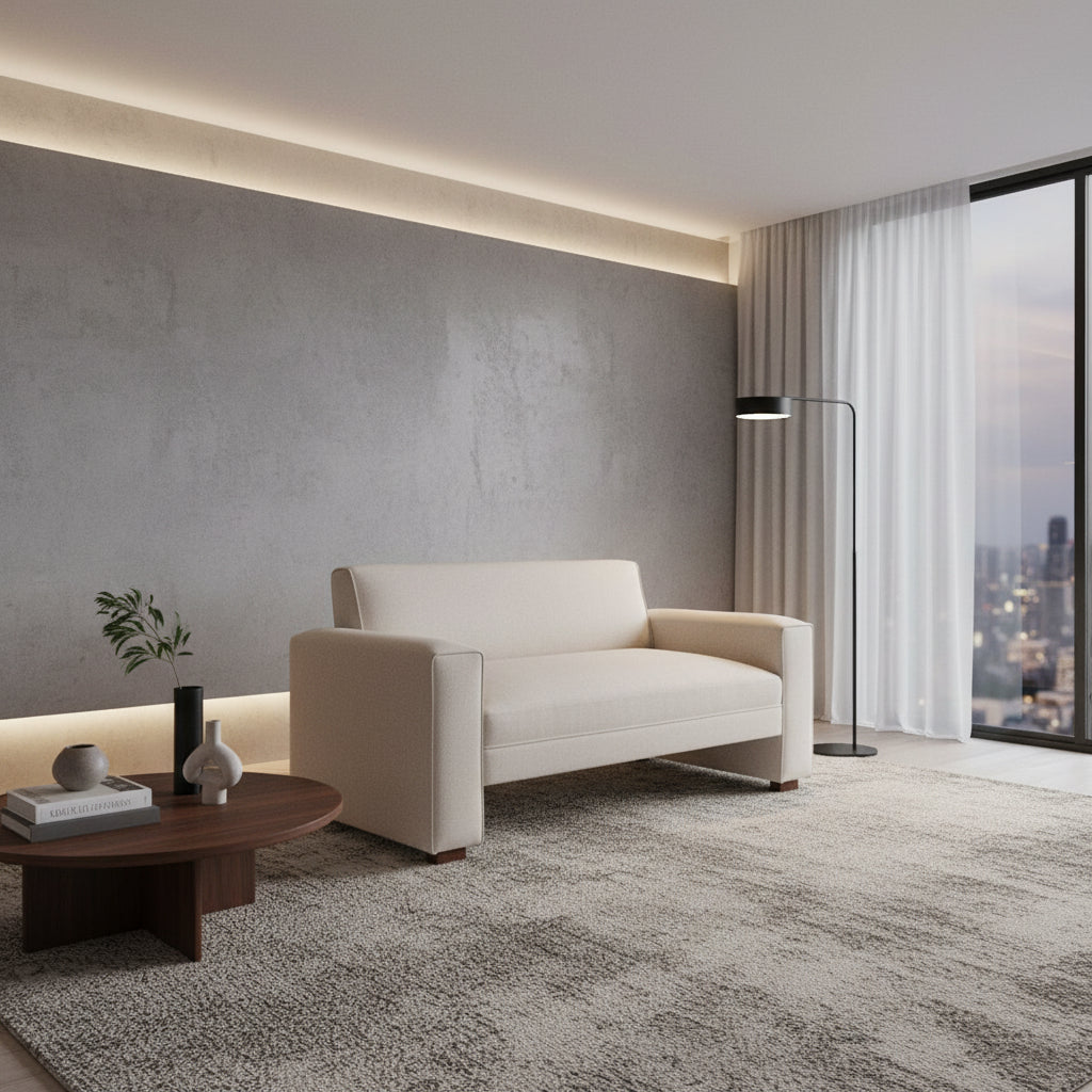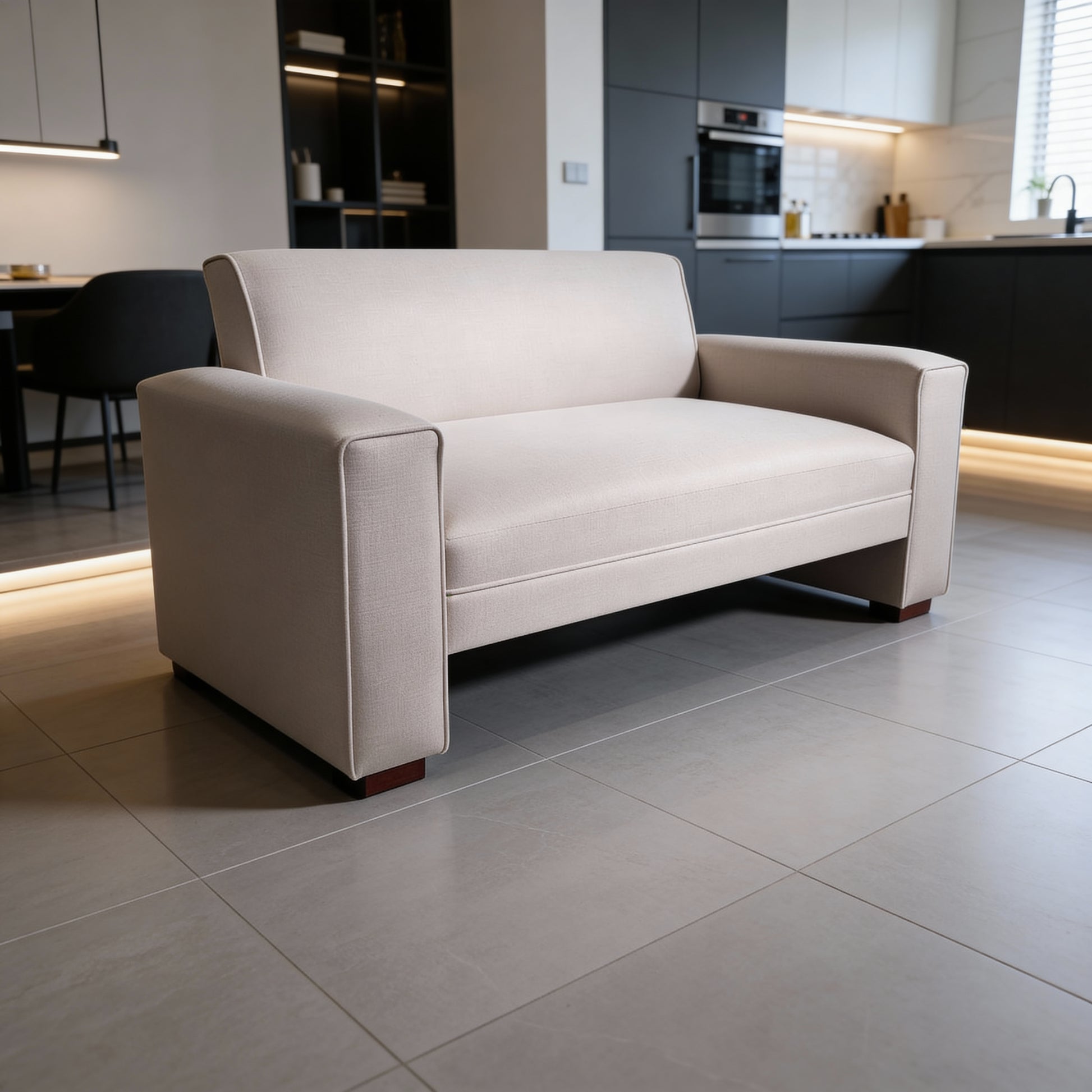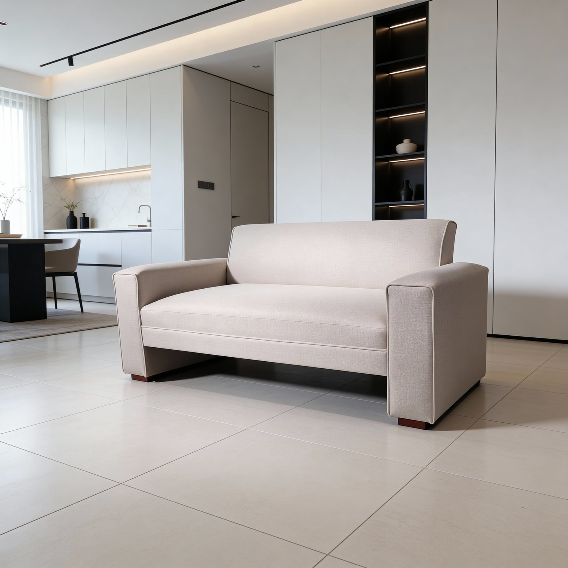 Sofá de diseño compacto con estilo nórdico y líneas modernas. Tapizado en lino Color Arena con costuras expuestas que realzan su carácter único. Ideal para espacios pequeños sin perder comodidad ni elegancia, fabricado con resortes Pocket y materiales de alta calidad.