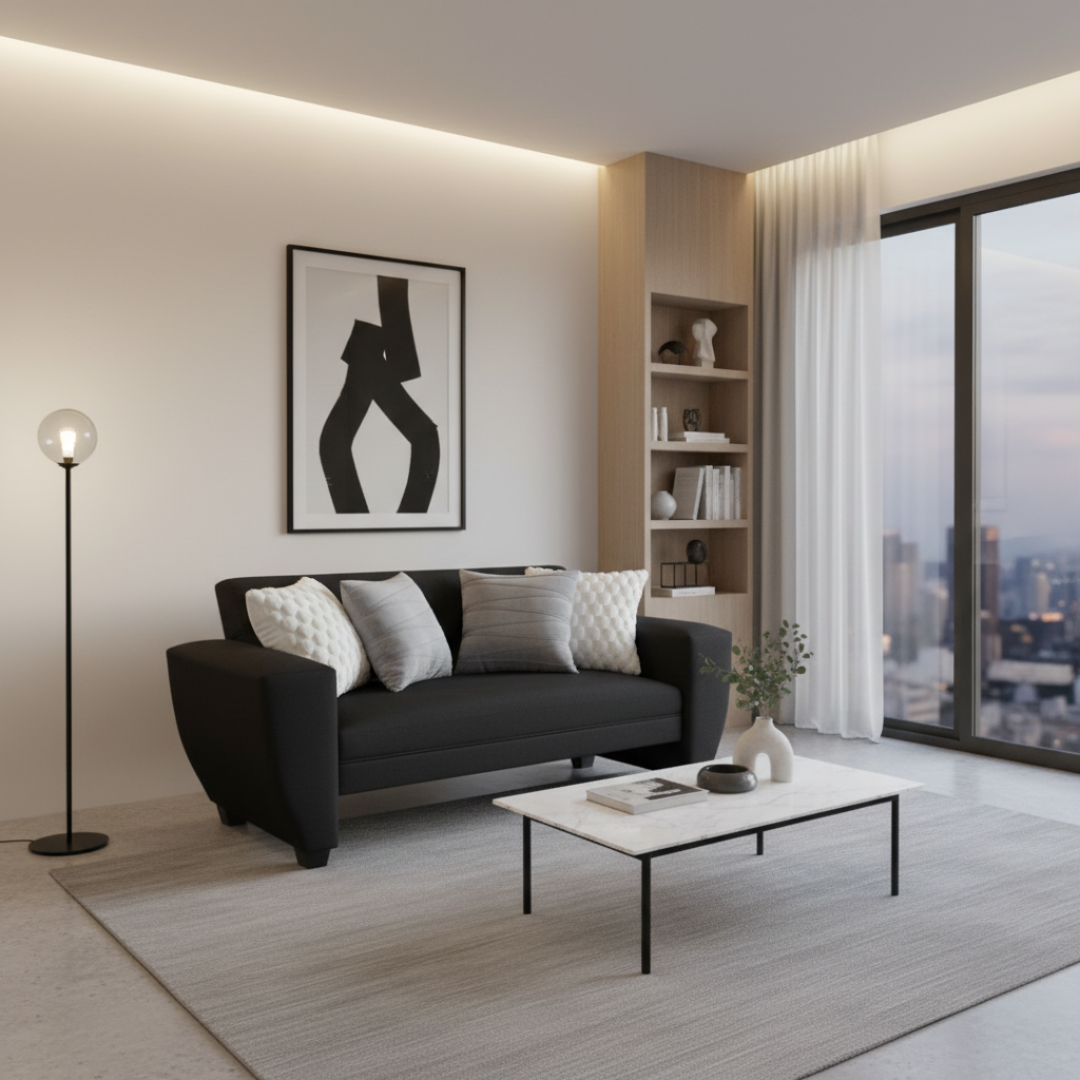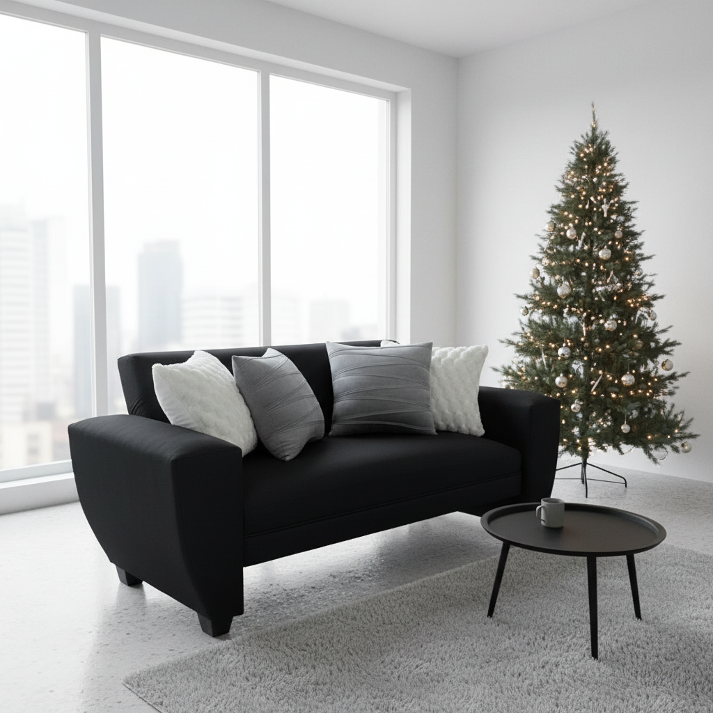Sofá de 2 cuerpos y medio tapizado en negro.