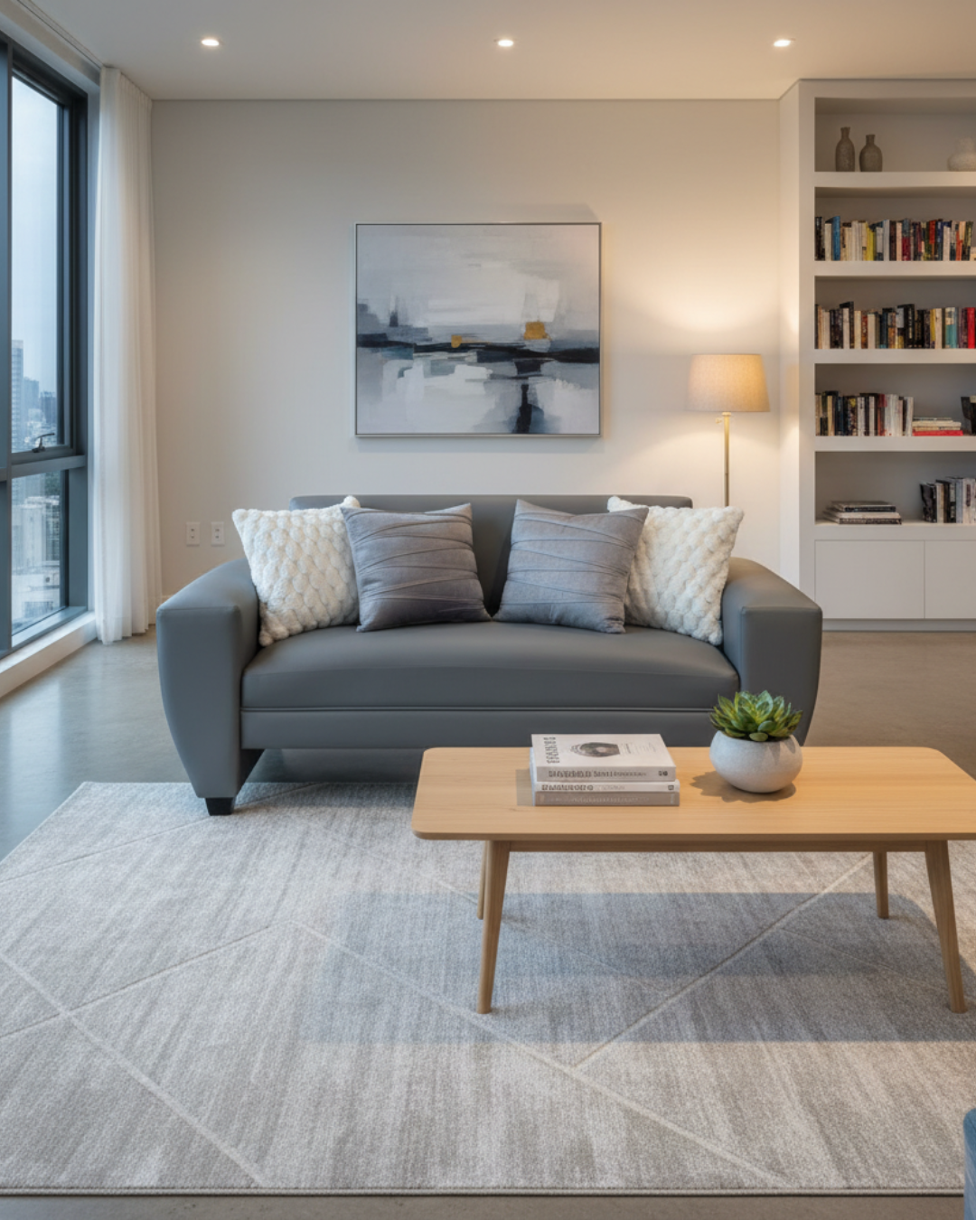 Este sofá está tapizado en cuero sintético gris, fácil de limpiar y con una apariencia moderna. Su estructura es firme y los asientos cuentan con resortes pocket, lo que garantiza mayor confort y una vida útil superior.