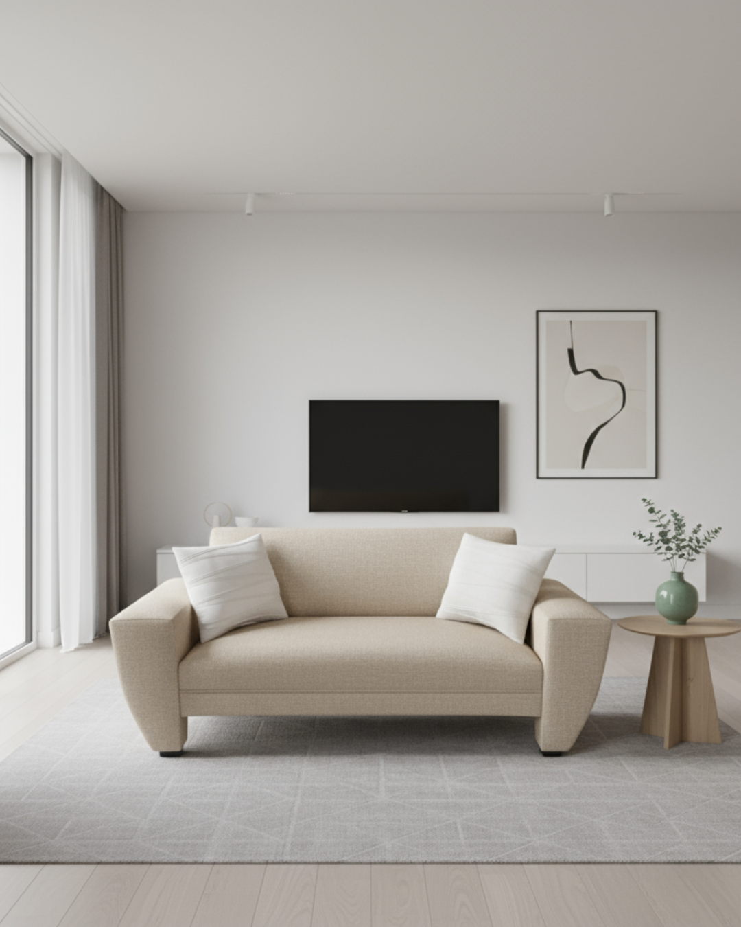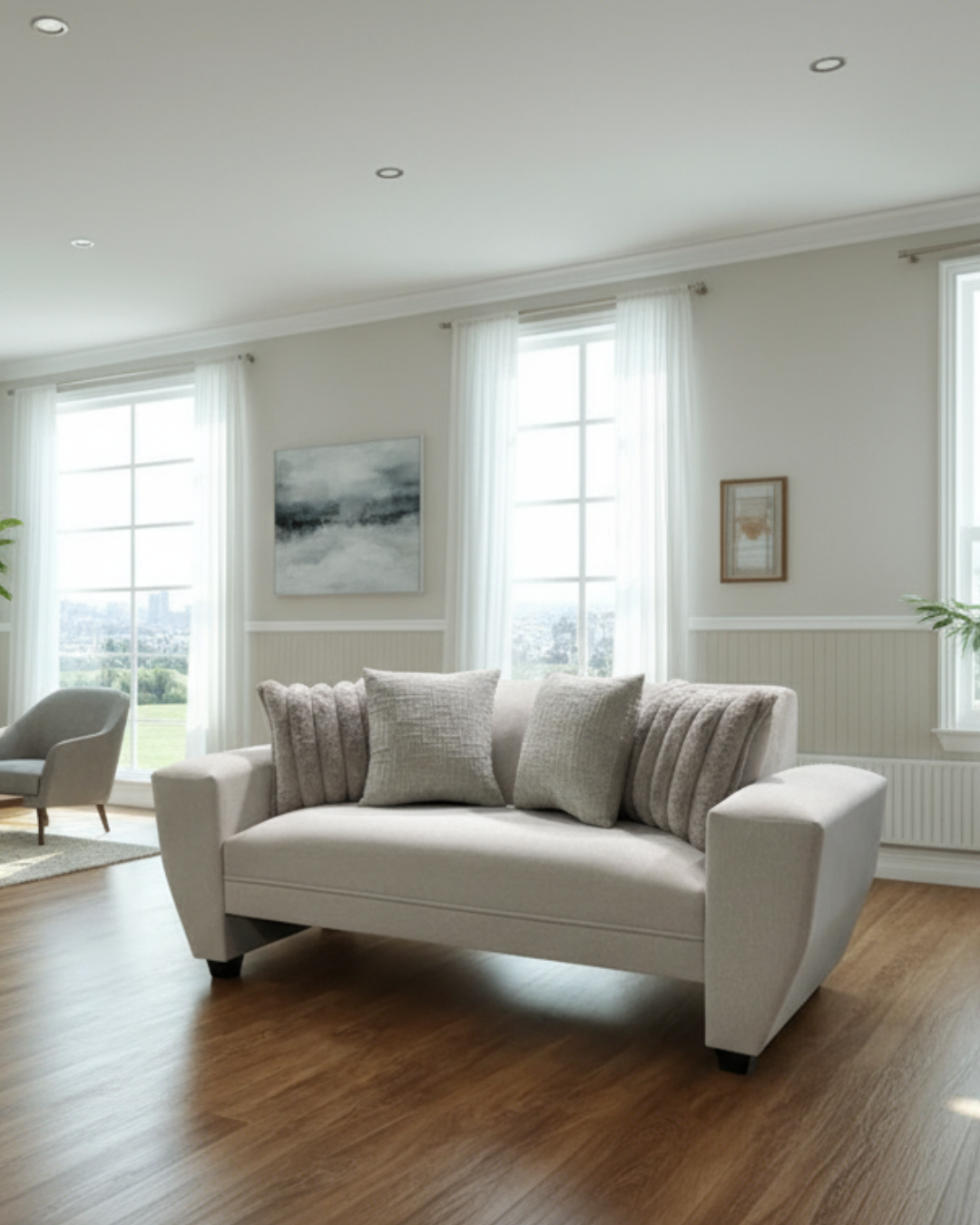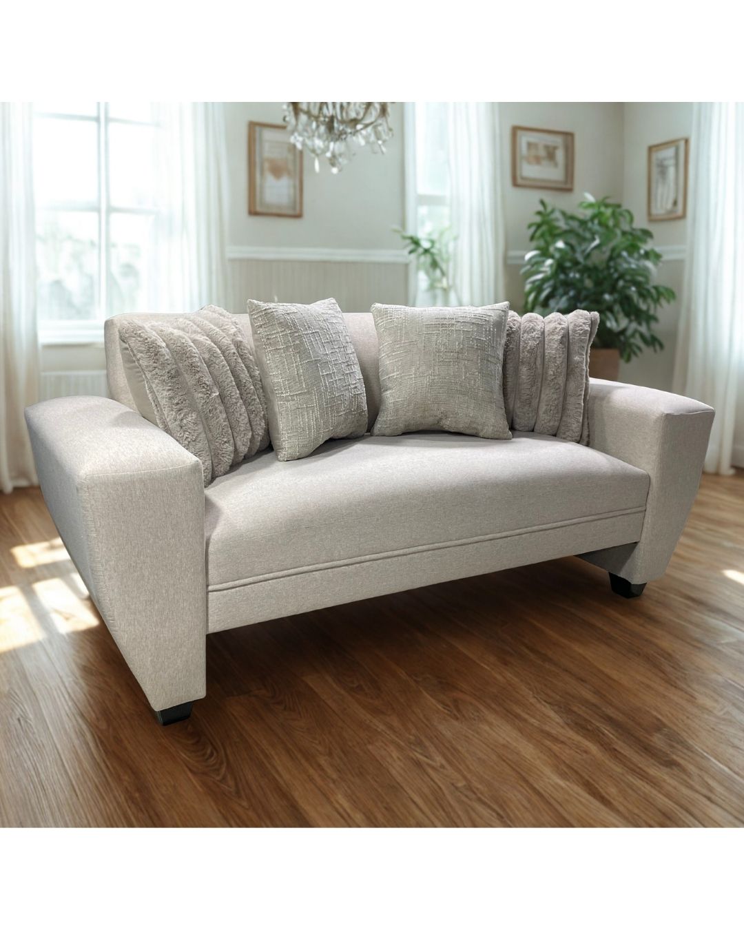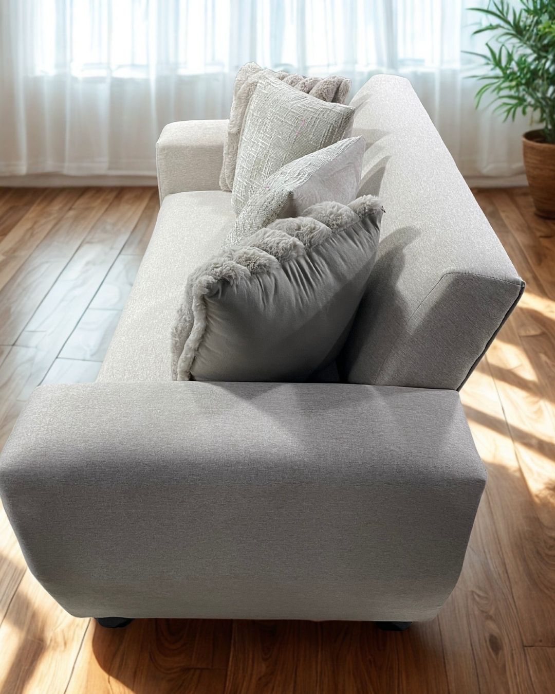 Sofá de 2 cuerpos y medio tapizado en lino tokio crema. Estructura firme con asientos de resorts para mayor comodidad y durabilidad. Incluye 2 cojines decorativos gratis .