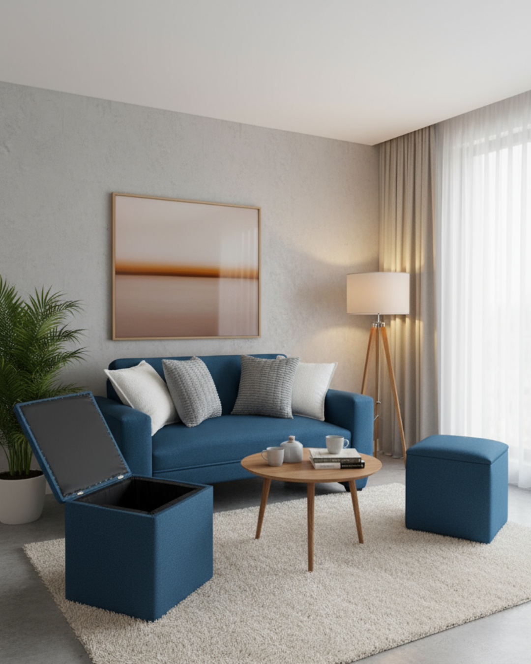 Sus dos puff con baúl incorporado son ideales para organizar tu hogar, guardando lo que necesites de forma discreta y manteniendo todo en orden. Además, pueden usarse como apoyo extra para tus visitas o como descansa píes.