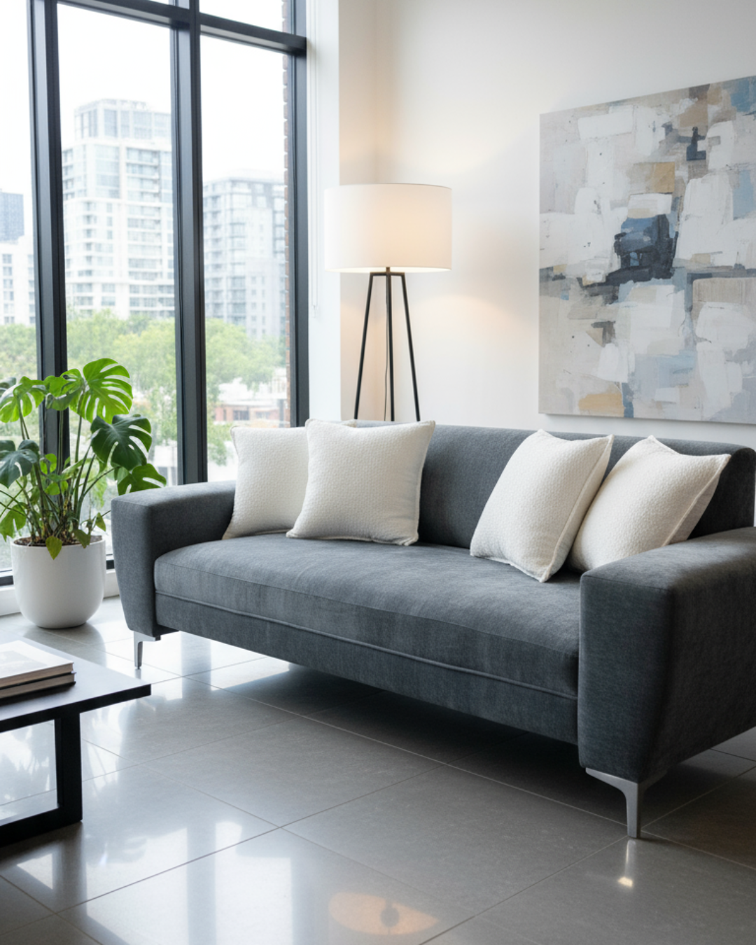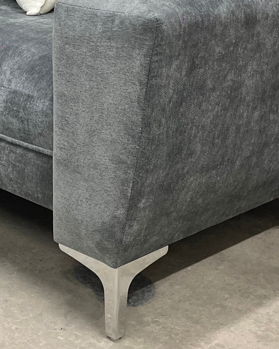 Diseño moderno y elegante tapizado en felpa Lino Dallas color gris envejecido, una tela suave y aterciopelada que aporta calidez y estilo.